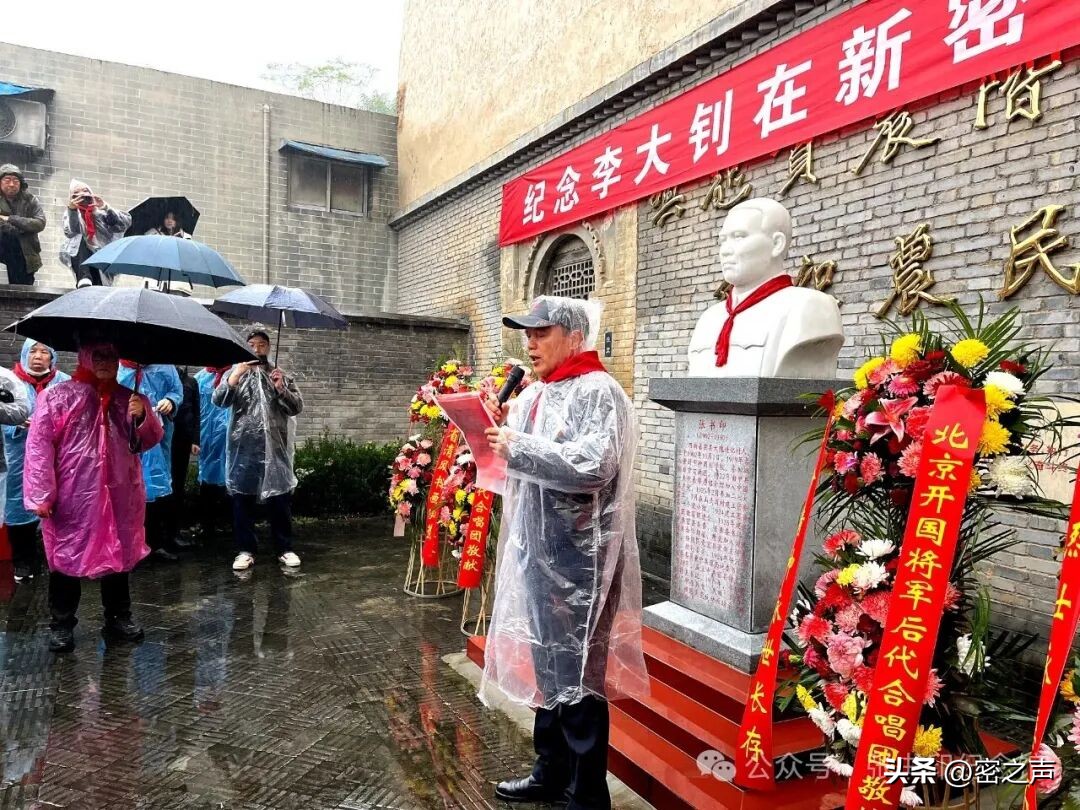 庄严肃穆的氛围中,雨水丝毫未减现场庄重。主持人邀请王亚丽、旷平淀副团长及河南省慈善联合总会红色薪火传承基金会张克华主任登台就位。三位嘉宾缓步走向张书印烈士雕像,细心整理花篮缎带并深深鞠躬,以躬身之举表达对革命先驱的深切缅怀。随后,新密红色文化促进会执行会长高永清老师在雨中致欢迎辞,言辞恳切回顾张书印英烈的革命事迹;新密市老促会常务理事张怀洲教授冒雨深情讲述《李大钊在新密调研100周年》,带领在场人员重温峥嵘岁月,现场所有人认真聆听、神情肃穆,让红色记忆在代代人心中深深扎根。