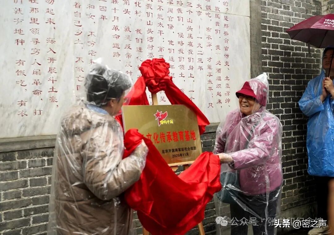 仪式进入核心环节,北京开国将军后代合唱团王亚丽、旷平淀两位副团长冒雨走到揭牌区,在众人注视下缓缓揭开“红色文化传承教育基地”牌匾红绸。雨水打湿了红绸与两位副团长的衣衫,却让牌匾上的红色字体在雨雾中更显熠熠生辉,现场响起热烈掌声,标志着张书印纪念馆正式成为承载红色教育、传承革命精神的重要阵地。