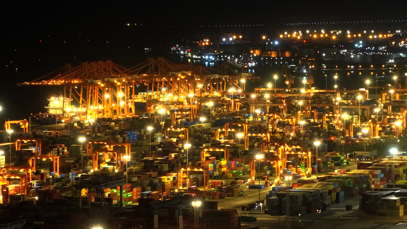 正在进行晚间作业的钦州港码头(9月4日摄,无人机照片)。