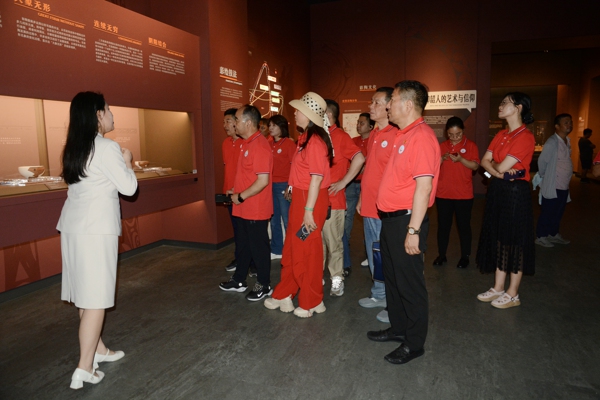 活动中,商会企业家和党员代表怀着崇敬之心,在解说员的引导下,依次参观了博物馆内"星空下的村落"、"时光年轮"等核心展区。在距今6800年至3500年的大河村先民生活遗迹前,大家长久驻足。那些精心复原的仰韶文化房基、古朴精美的彩陶双连壶、绘有星象纹饰的陶钵,以及粟作农业的考古实证,无声诉说着黄河岸边灿烂悠久的农耕文明与先民智慧,生动展现了中华文明起源的绵延不断与生生不息。