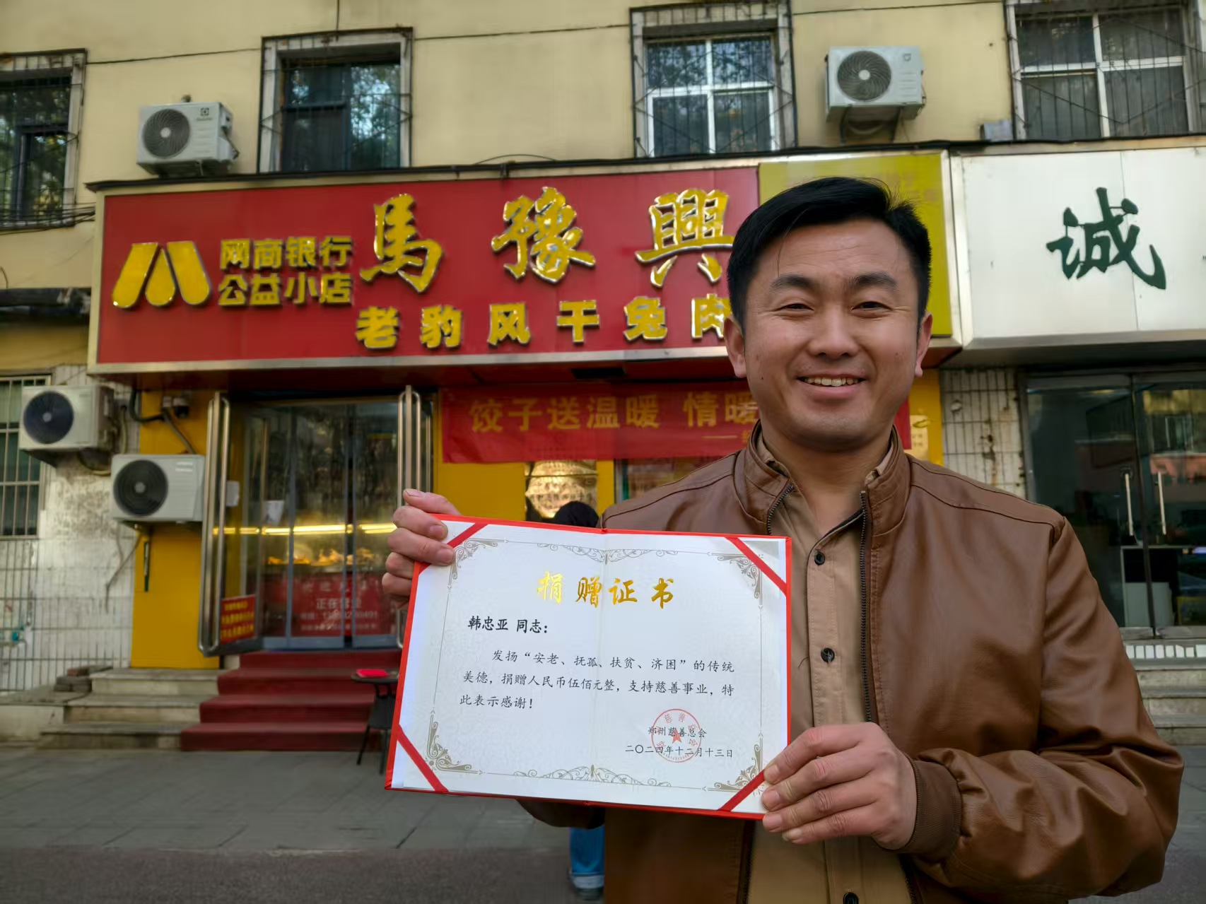 他们的公益足迹,早已跨越季节与场景。疫情爆发时,韩忠亚主动请缨成为经八路办事处的志愿者,冲锋在抗疫一线;他还在店门口张贴海报,为防疫医护人员和志愿者提供购物折扣,免费供应饮水、开放充电接口,用小店的力量为 "逆行者" 撑起一片港湾。2023 年河北涿州遭遇洪涝灾害,他第一时间参与捐款;2024 年 12 月,他向郑州市慈善总会捐赠 500 元,手中的荣誉证书见证着这份坚持。
