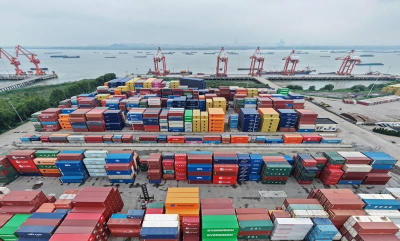 9月8日拍摄的江苏省扬州港集装箱堆场(无人机照片)。