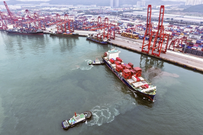 9月8日,在山东港口集团青岛港,一艘装载外贸集装箱的货轮驶离泊位(无人机照片)。